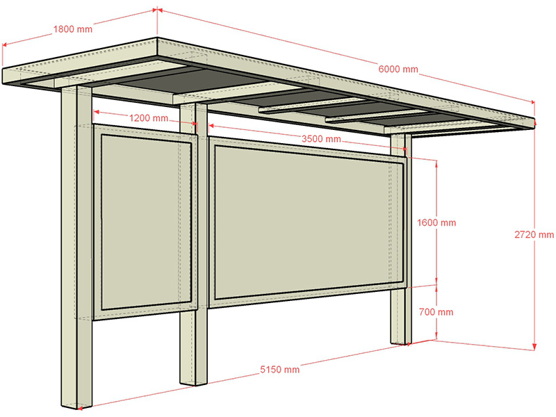 常規(guī)公交候車(chē)亭規(guī)格為:6000*1800*2720mm,一臺(tái)公交站臺(tái)6米。