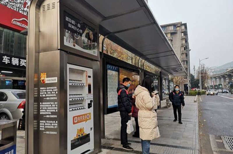 巴南智能不銹鋼公交候車亭是公交站臺(tái)智能服務(wù)創(chuàng)新平臺(tái),集成了市民候車、線路信息、便民標(biāo)識(shí)、數(shù)字媒體、無(wú)線充電和USB充電、智能語(yǔ)音播報(bào)、無(wú)線充電、新風(fēng)系統(tǒng)等多功能于一體的智能公交站臺(tái)。筆者看到,在候車亭左側(cè)還配備了自動(dòng)售賣機(jī),為候車乘客提供飲料、礦泉水、紙巾、雨傘、口罩等日常物資。